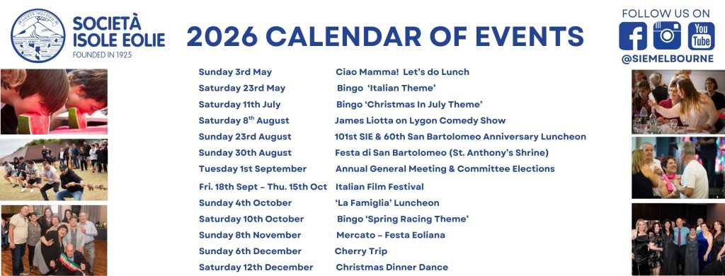 We encourage you to be part of the longstanding history of the Società Isole Eolie (SIE)– one of the oldest running Italian social clubs in Australia, by coming along to our vast variety of events we host every year.